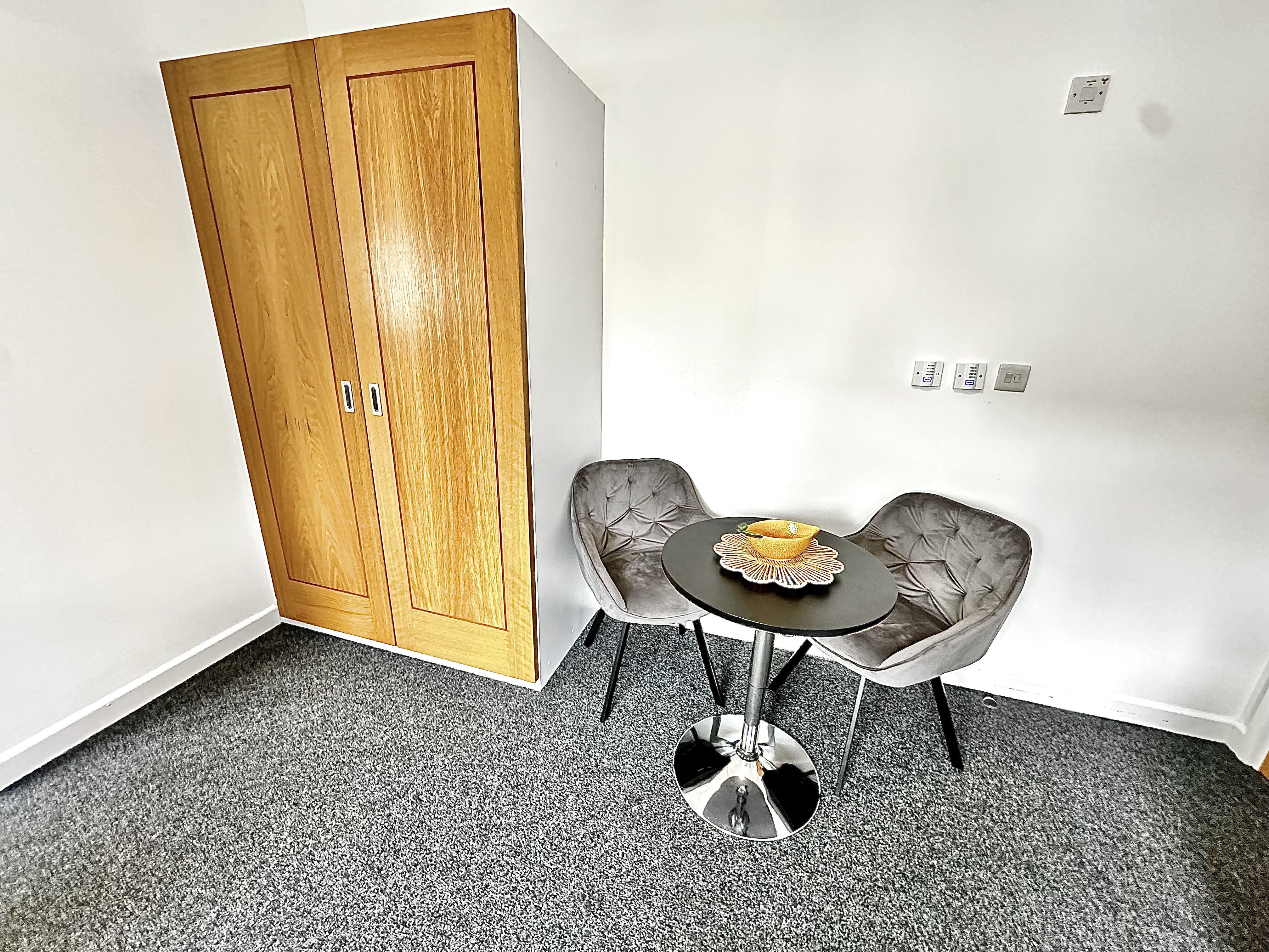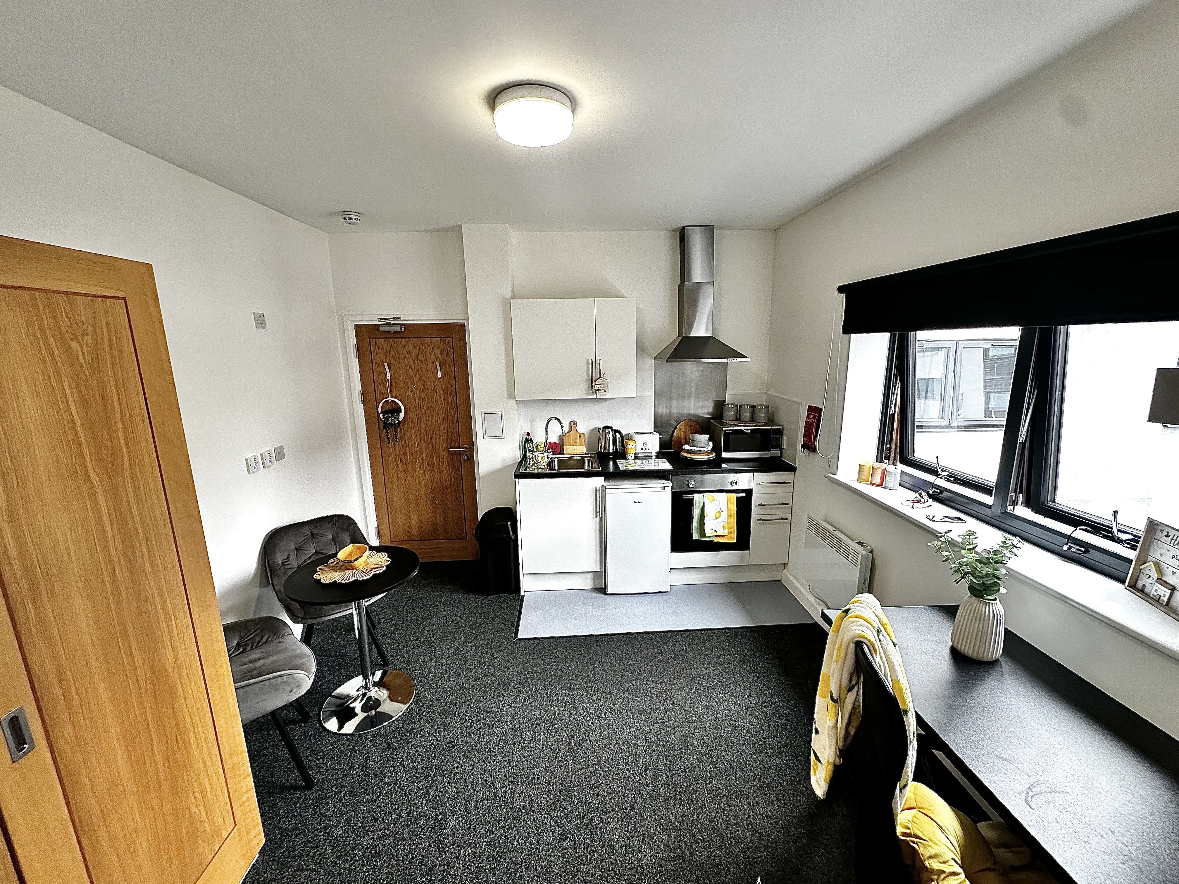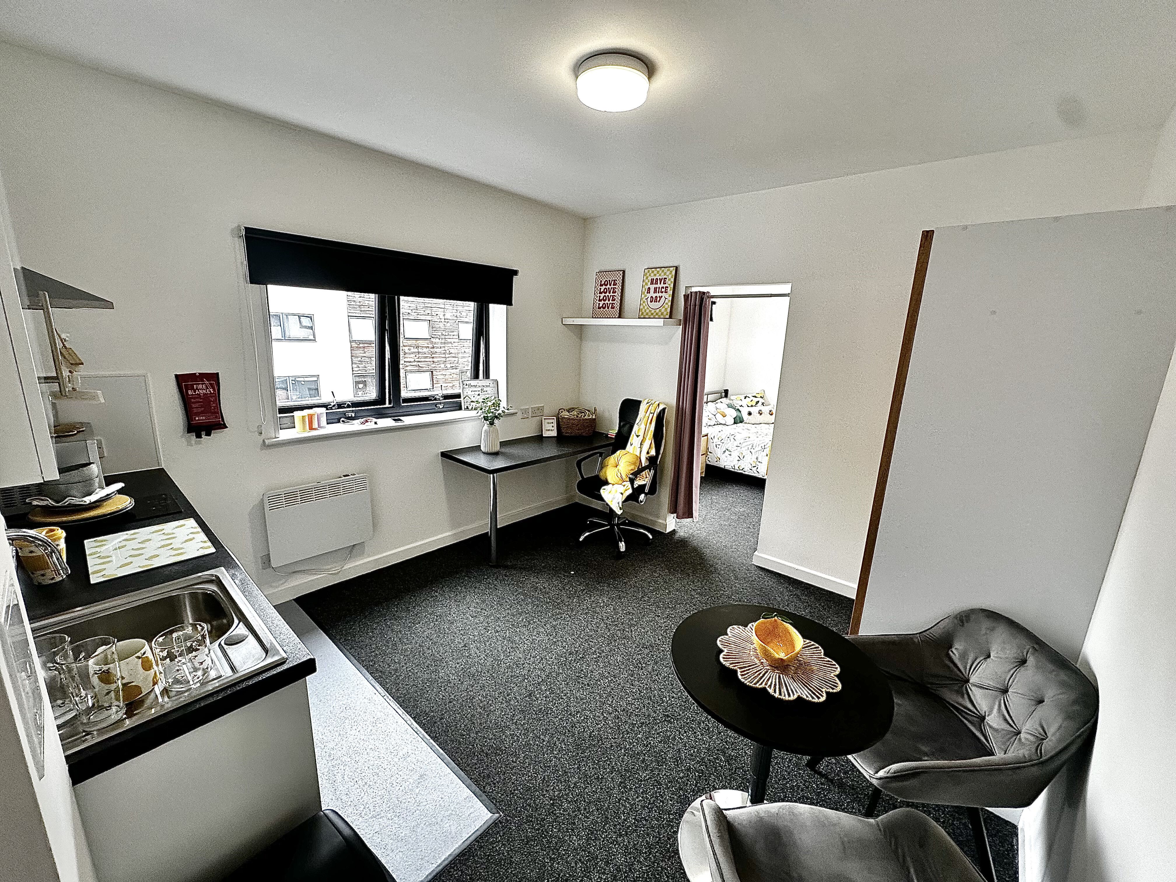 These one bed flats offer the best Loughborough student accommodation for space. You can enjoy a huge living area that is available for yourself or for dual occupancy. The massive kitchen and lounge area is separate from your sleeping area so you can enjoy apartment living to the maximum. The bedroom offers a generous space for you to relax in and watch TV on our complimentary flat screen TVs. You'll find your modern bedroom also comes with a personal washroom that has a rainfall shower and offers a stylish design so you can live in luxury whilst studying at University.